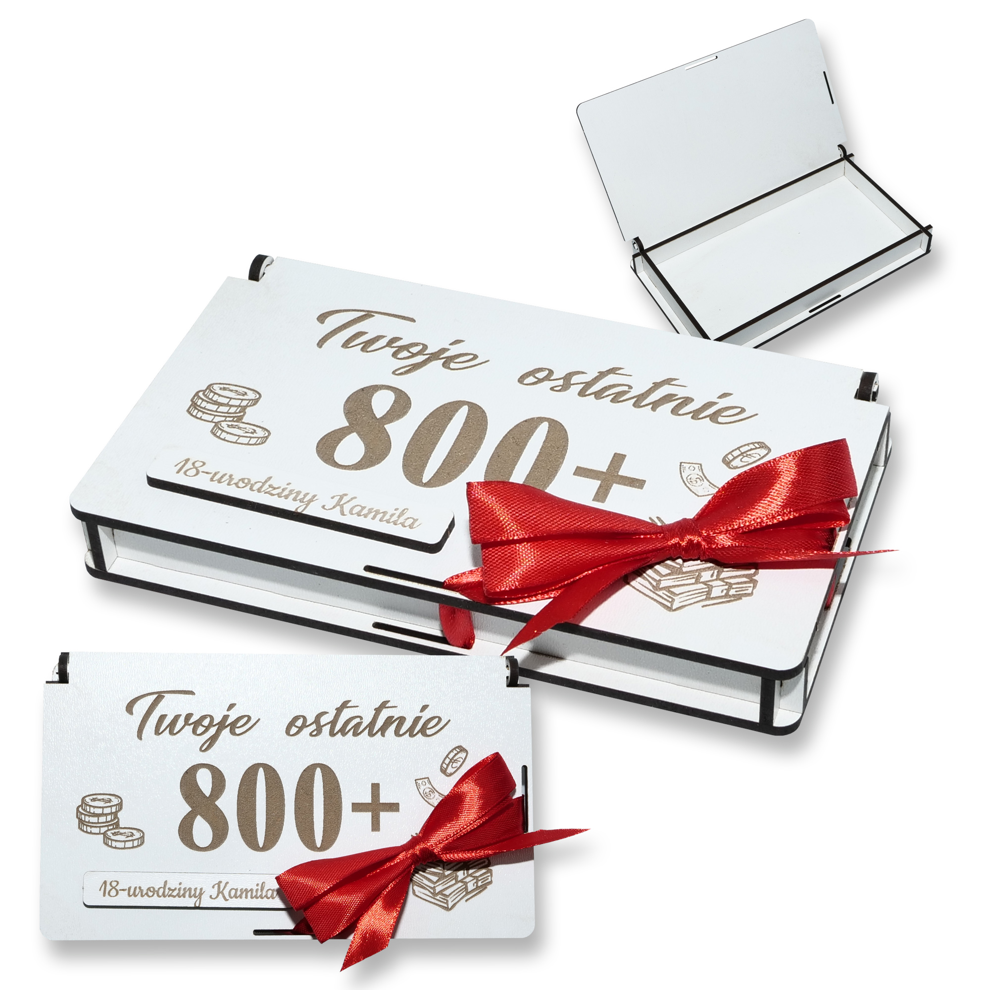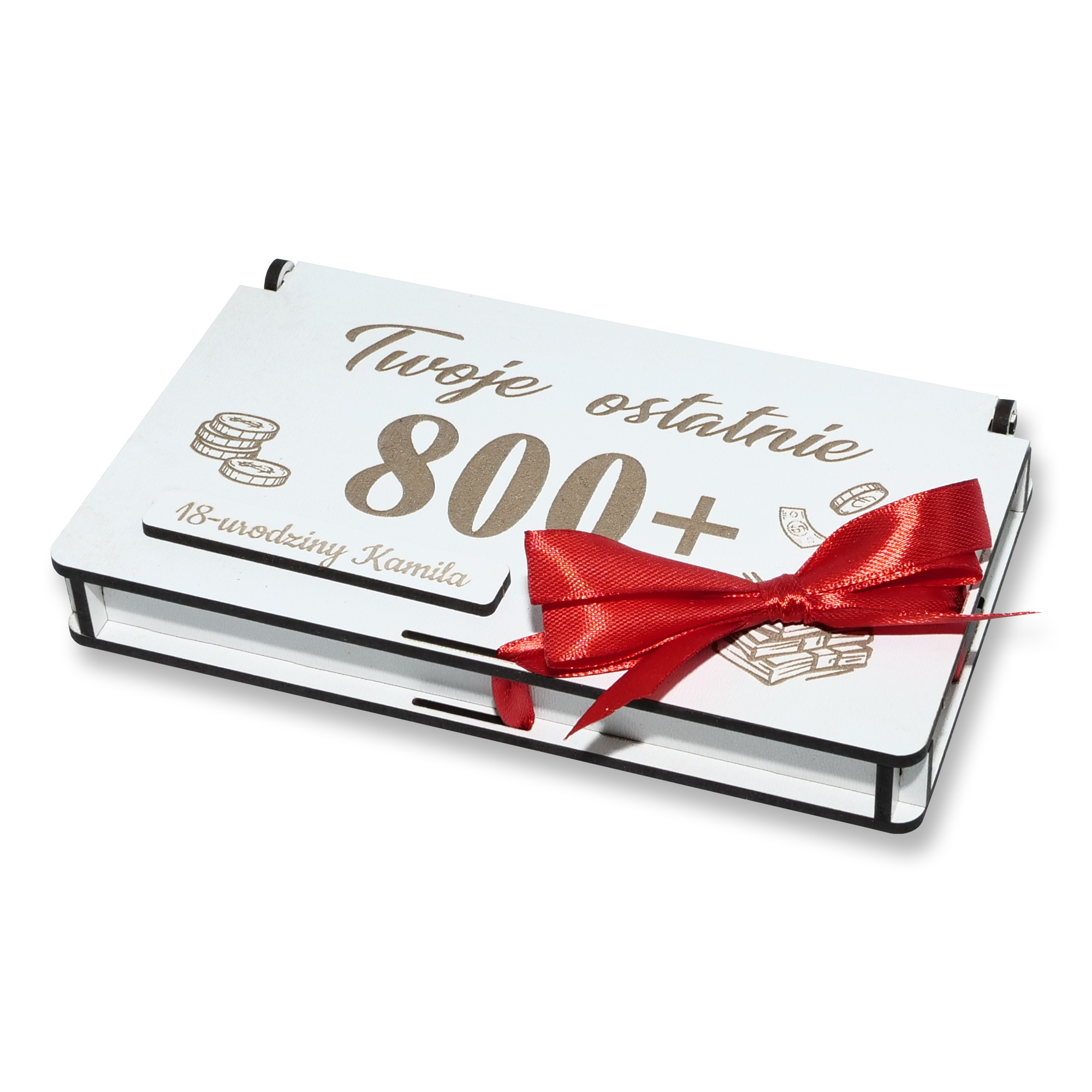 Pudełko koperta na pieniądze – prezent na 18 urodziny „Twoje ostatnie 800+ / 500+” to oryginalny i zabawny sposób na wręczenie gotówki z okazji wejścia w dorosłość. Idealnie sprawdzi się jako dodatek do prezentu lub samodzielny upominek, który wywoła uśmiech i zostanie pamiątką na dłużej.